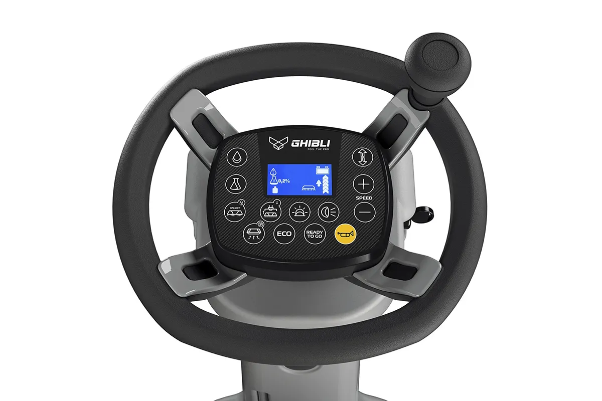 Mit dem praktischen und intuitiven Bedienfeld, das in das Lenkrad integriert ist, können alle Funktionen der Maschine gesteuert und verwaltet werden: