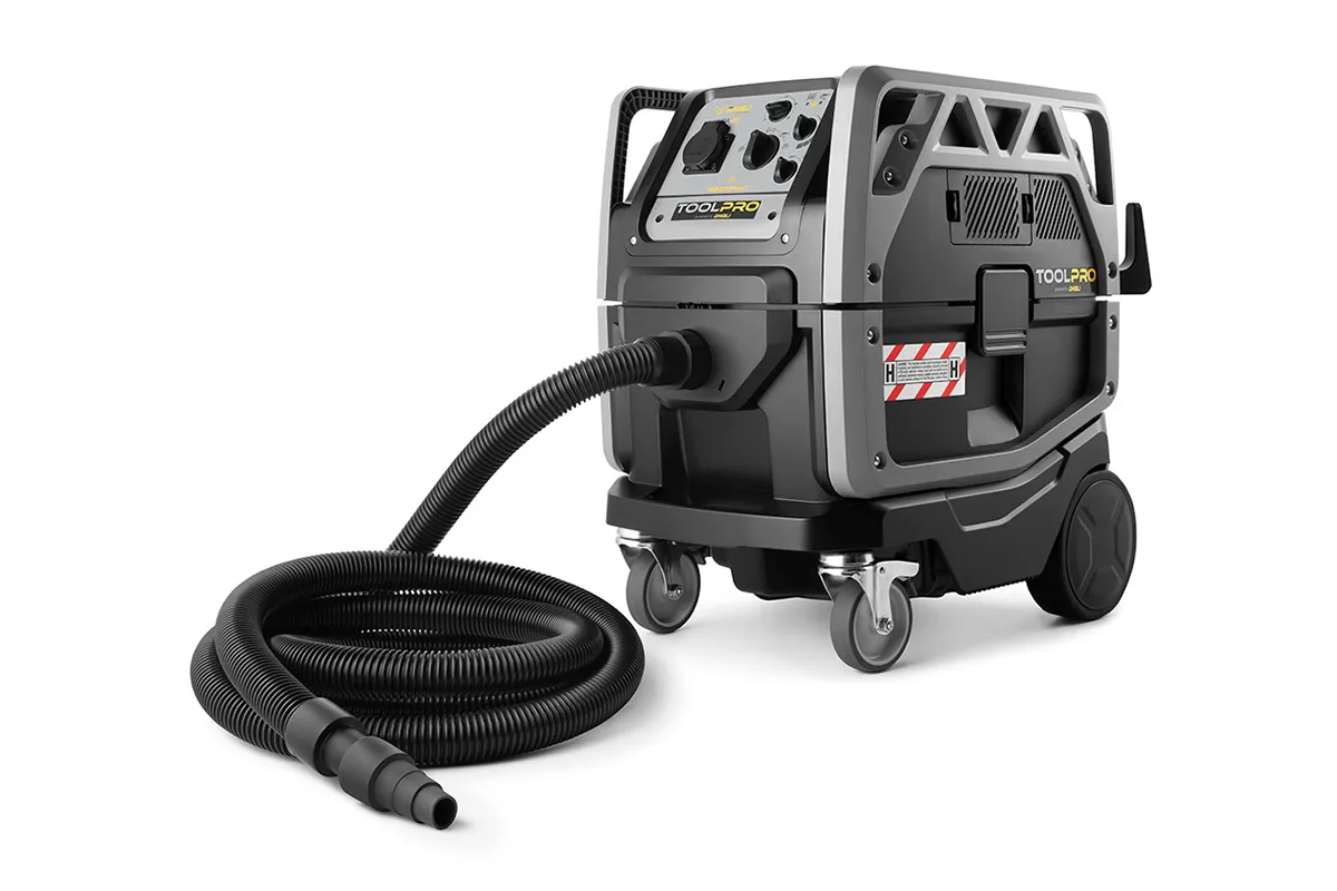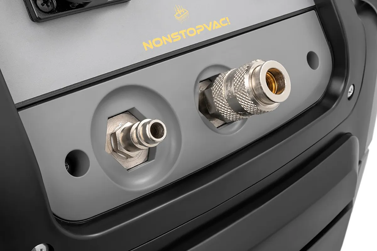 Ausgestattet mit einer Steckdose für Elektrowerkzeug (max. Leistung 2400 W) und dem Kit COMBI zum Anschluss von Druckluftwerkzeugen (optional), um einen Betriebsdruck von bis zu 10 bar zu gewährleisten. Das Gerät kann manuell oder automatisch (gesteuert durch das angeschlossene Werkzeug) eingeschaltet werden, und es ist auch möglich, den Staubsauger dank des Remote Control Kits (optional) direkt vom Schlauch aus einzuschalten.